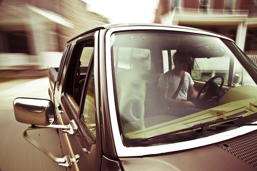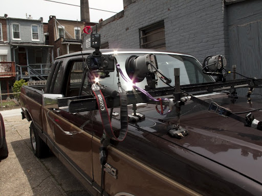 So in my head, Peanut (dog,) has his head stretched out the window, tongue out, wind blowing through his hair, while the background blurs into a swirling mass of urban colors and a deep blue sky. I got the car mount from Serious grip and Electric, spent about an hour building it, got the lights firing intermitently off my inverter (a tru sine wave inverter could have saved some frustration there), and lured the dog into the truck. Normally he loves riding in the truck and is all about the wind in the face, but for some reason he had no interest in the window. He’s a little skittish as it is, so he just nestled up to me for the better portion of the ride. Regardless of how much planning you do, some variables you just won’t have control over. All in all the shot didn’t pan out the way I had imagined it, but I still got a couple of good frames. Maybe I’ll try to merge the exposures to see if there is a more interesting image somewhere. Here’s some shots of the rig and a video clip of the build and the ride.