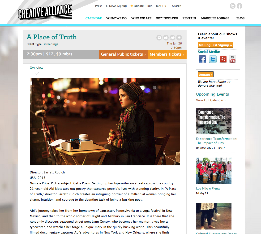 A Place of Truth will be screening at the Creative Alliance on Thursday June 26th at 7:30 pm. Tickets Here.